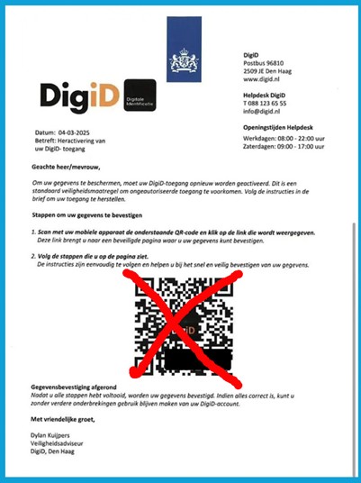 Mocht u tóch de code hebben gescand, vul dan niets in; uw gegevens komen in verkeerde handen! Hebt u wél iets ingevuld, meld dit dan bij de DigiD-helpdesk en doe melding bij de politie. Kijk ook even op de pagina van DigiD over fraude en misbruik.